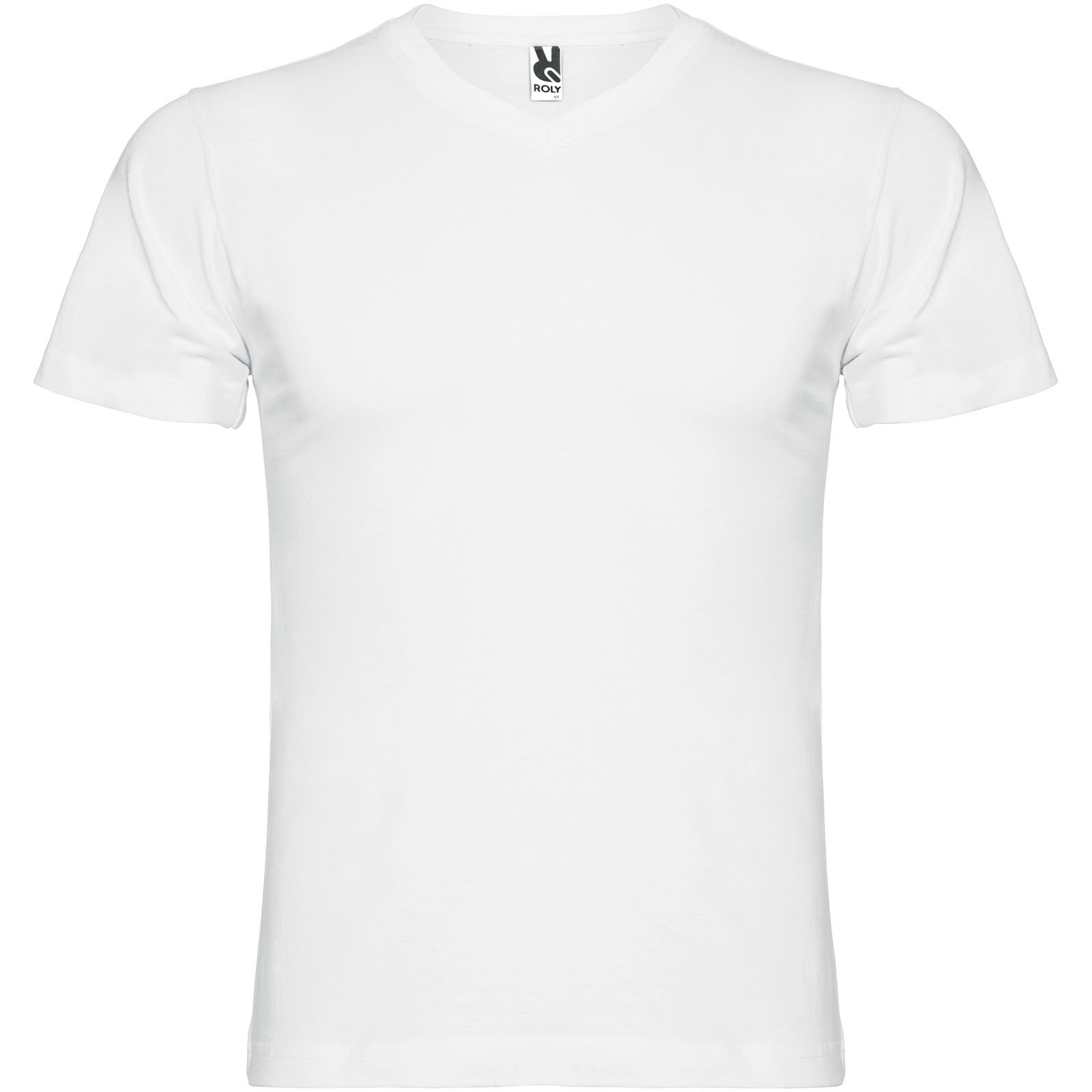 Camiseta de manga corta tubular y cuello en pico de 2 capas. Cubrecosturas reforzado en cuello y hombros. Etiqueta extraíble. El modelo mide 190 cms y lleva la talla L.