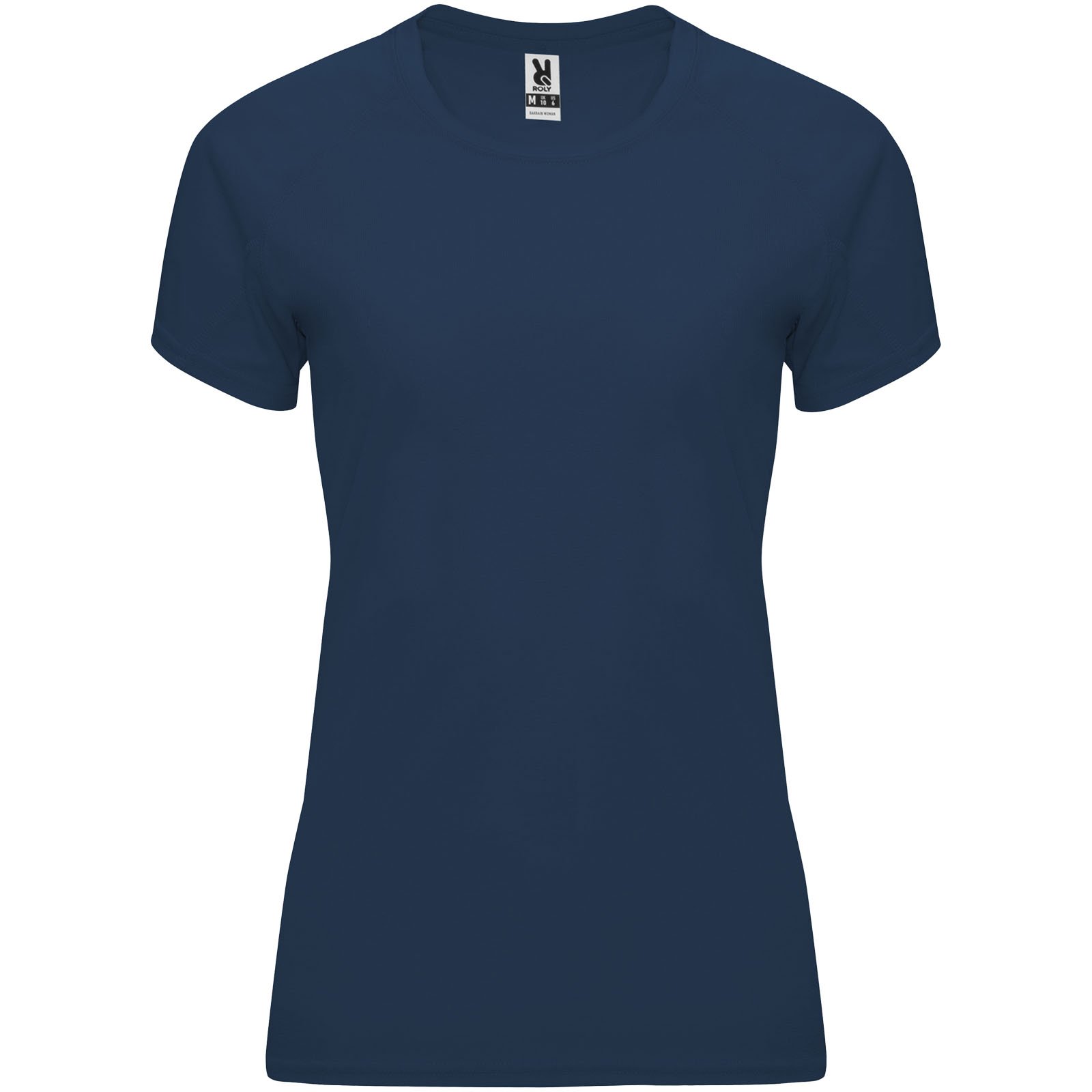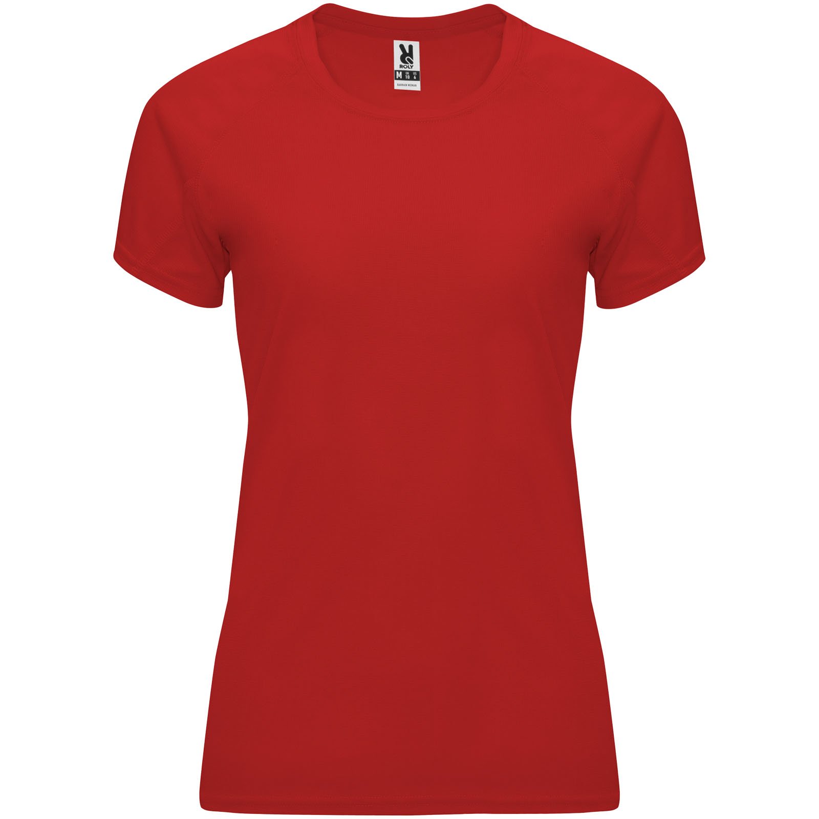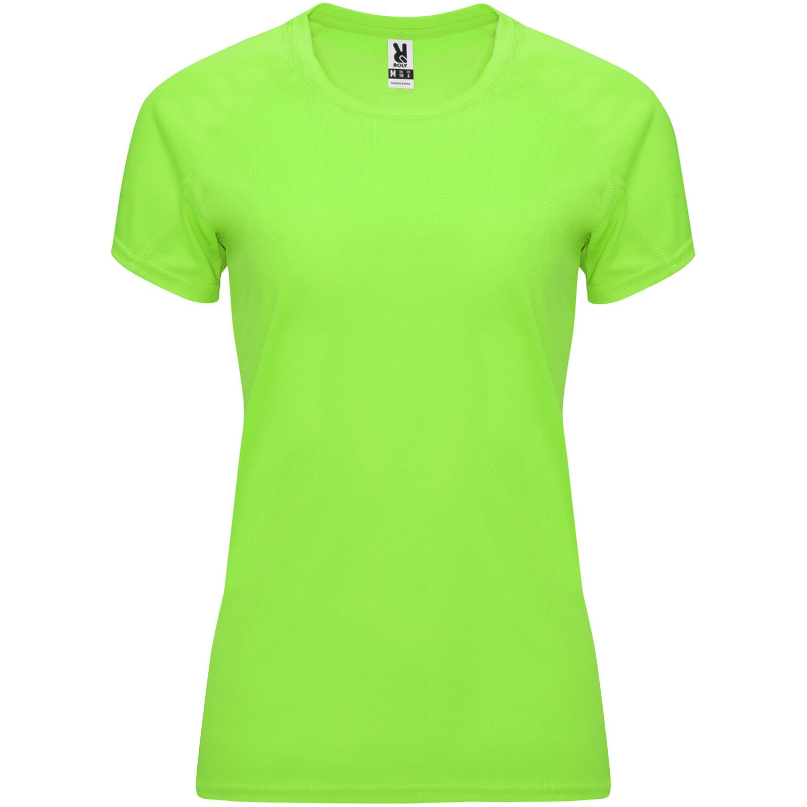 Camiseta técnica entallada de manga corta ranglán para mujer, con cuello redondo y cubrecosturas a juego. Paneles en mangas. Remallado a tono en sisa y panel de manga. Tejido CONTROL DRY. Etiqueta extraíble. Tejido técnico. Factor de protección UV. La modelo mide 173 cms y lleva la talla S.