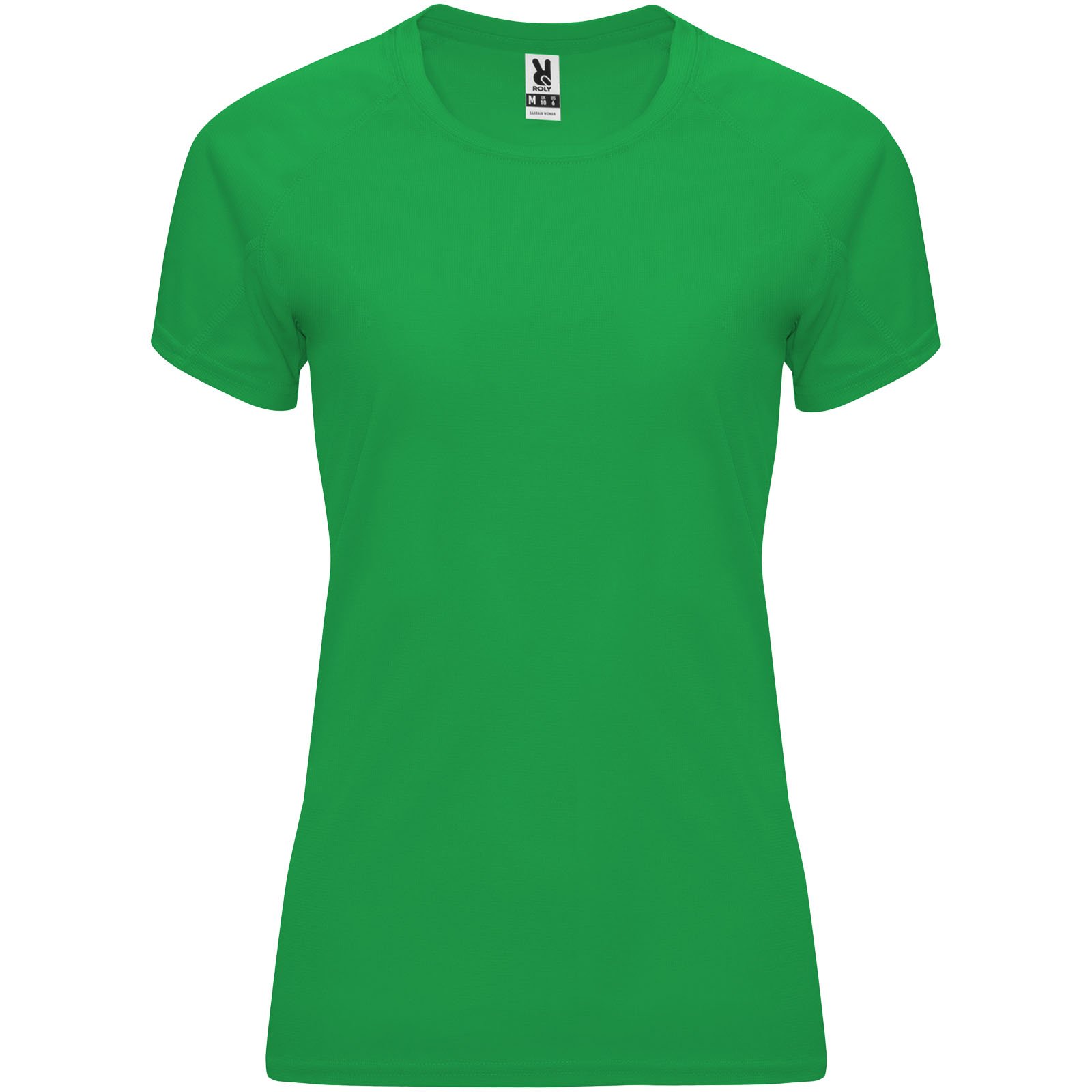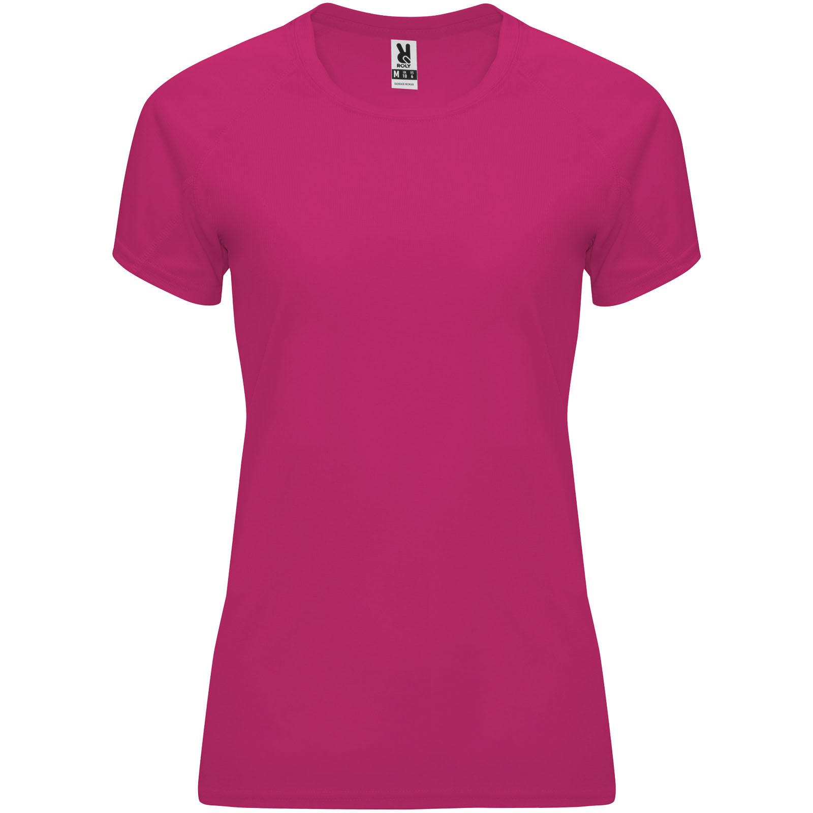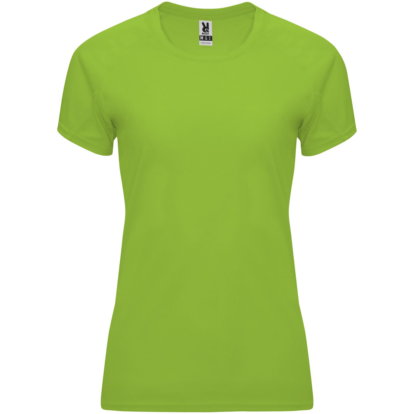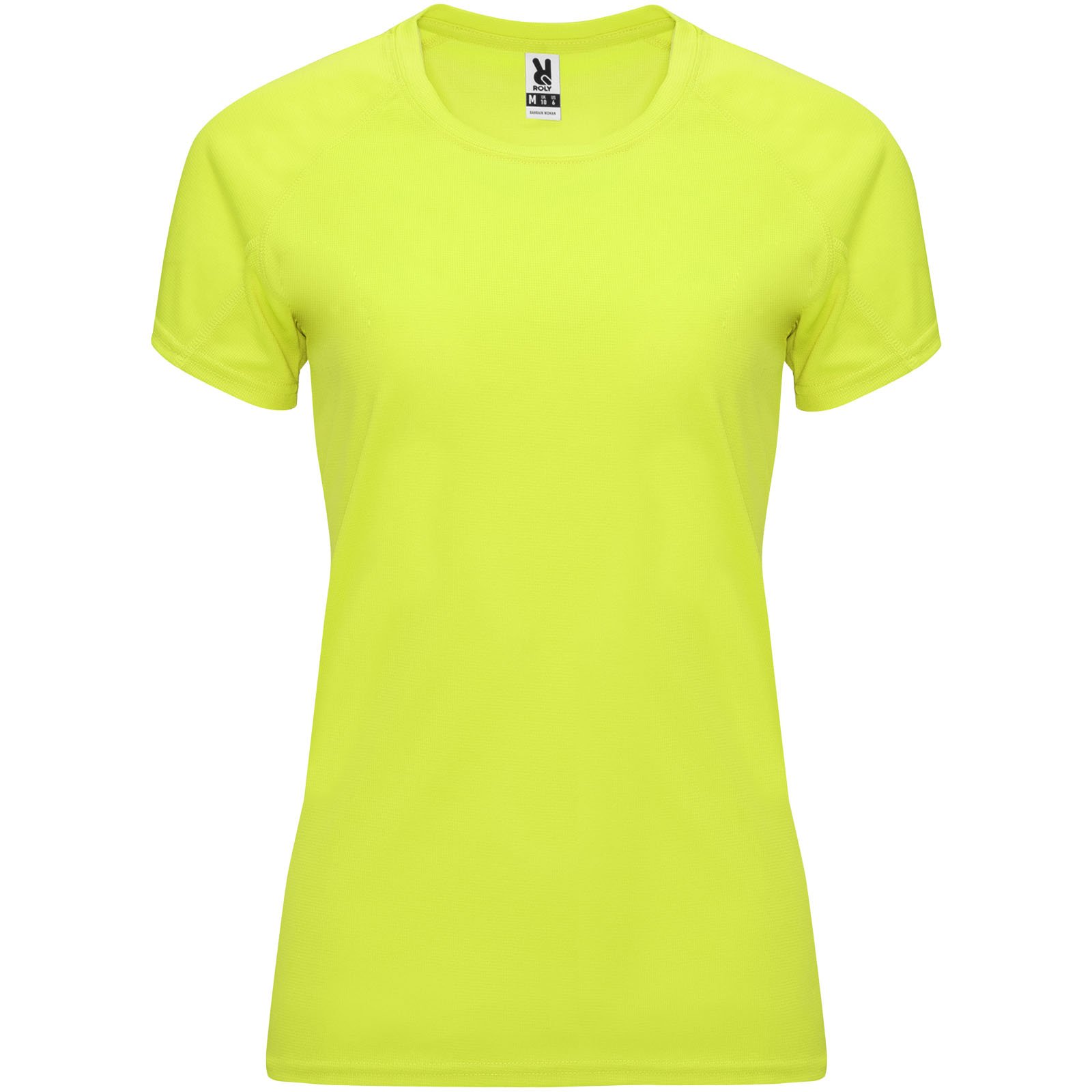 Camiseta técnica entallada de manga corta ranglán para mujer, con cuello redondo y cubrecosturas a juego. Paneles en mangas. Remallado a tono en sisa y panel de manga. Tejido CONTROL DRY. Etiqueta extraíble. Tejido técnico. Factor de protección UV. La modelo mide 173 cms y lleva la talla S.