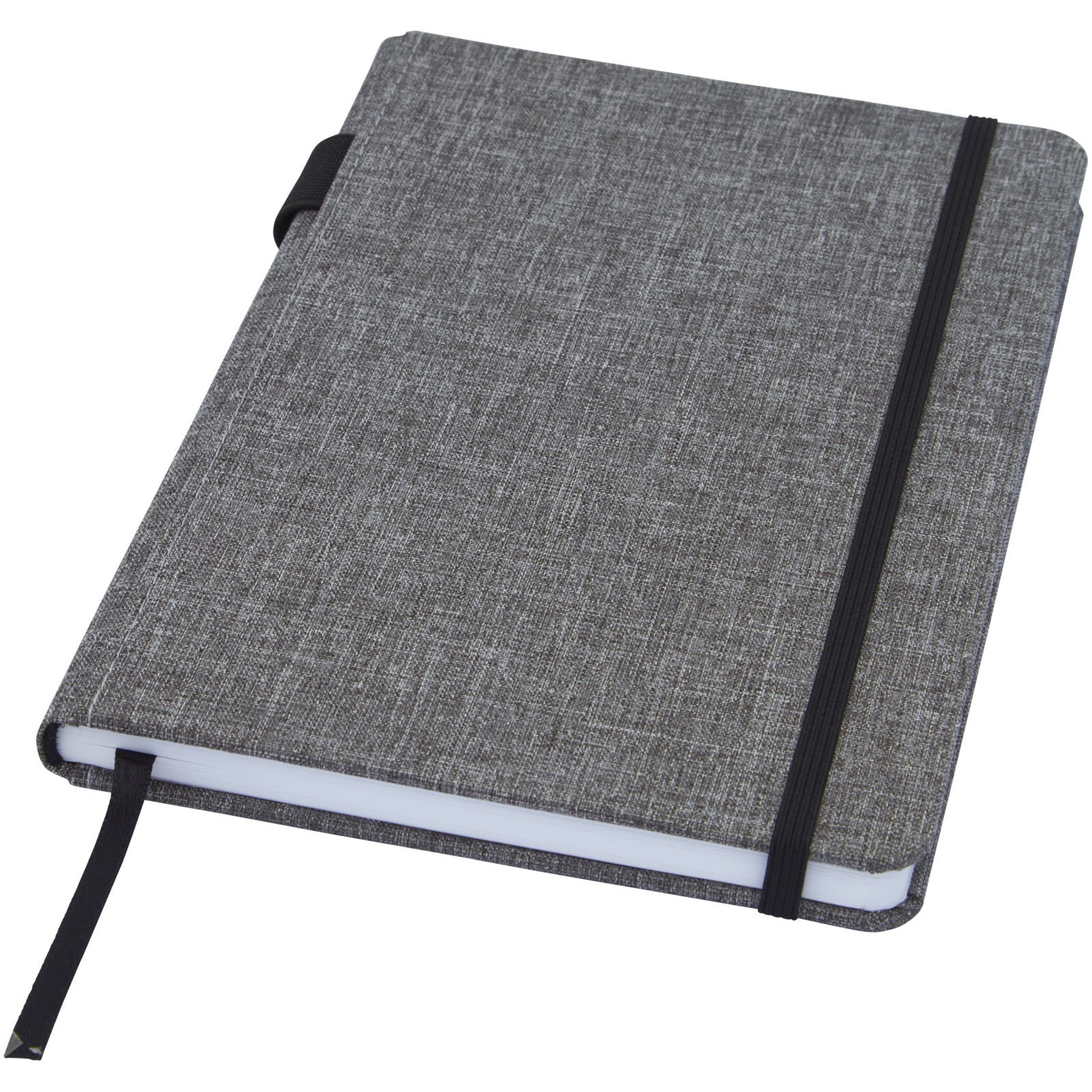 Libreta de tamaño A5 con tapa de tejido de PET reciclado. Cuenta con 96 hojas de papel reciclado de 70 g/m² con diseño rayado, soporte para bolígrafo y cinta marcapáginas. Embalado en una funda de cartón.