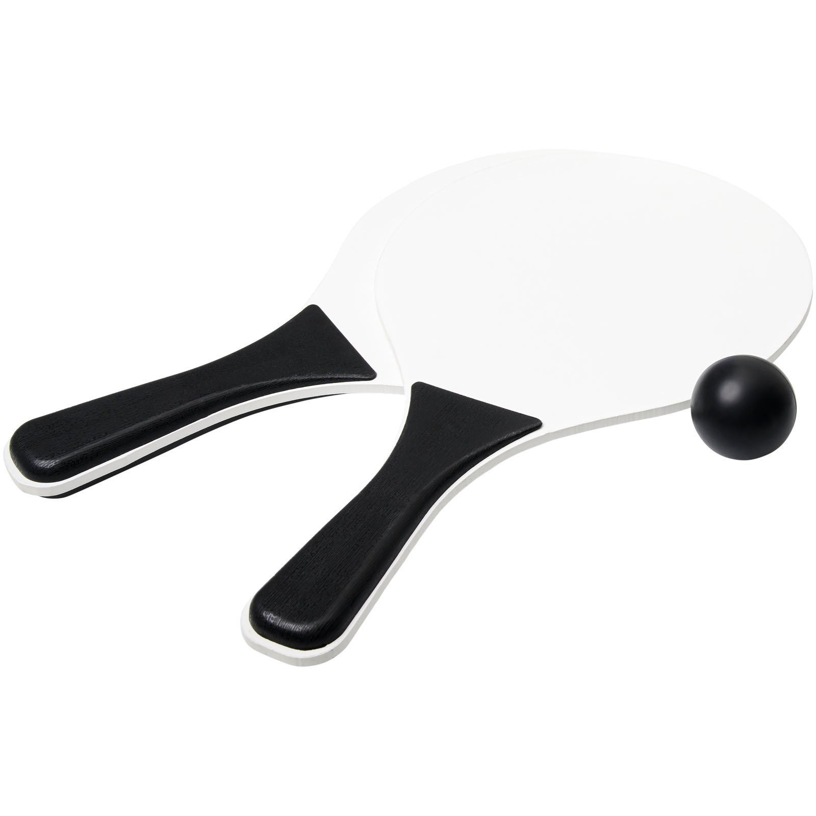 Disfruta de una diversión asegurada con este juego de playa, disponible en una amplia gama de colores. Este resistente juego de playa está hecho de madera prensada con mango de polipropileno de color. Se entrega junto con una pelota blanda de color en un envoltorio de malla que facilita su transporte para pasar un día divertido en la playa. ¡Advertencia! No apto para niños menores de tres años. Bolas pequeñas. Peligro de asfixia.