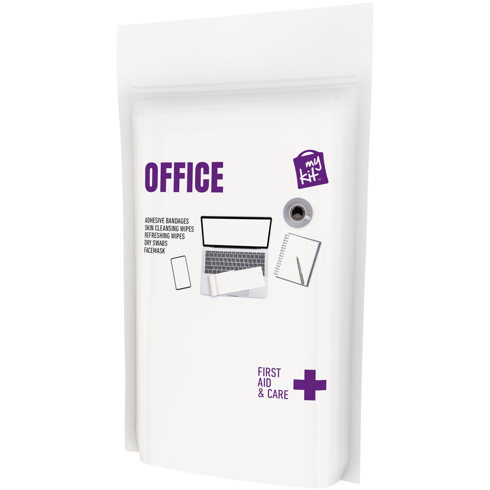Este kit debería guardarse en todas las oficinas para poder afrontar pequeños accidentes o lesiones. Contenido: 12 apósitos resistentes al lavado, 2 bastoncillos secos, 1 mascarilla, 1 toallita refrescante y 4 bastoncillos para limpiar la piel. Todos los productos de primeros auxilios y cuidado del kit cumplen con las normativas vigentes en la UE. El precio incluye impresión a todo color. Se entrega en una funda de papel.