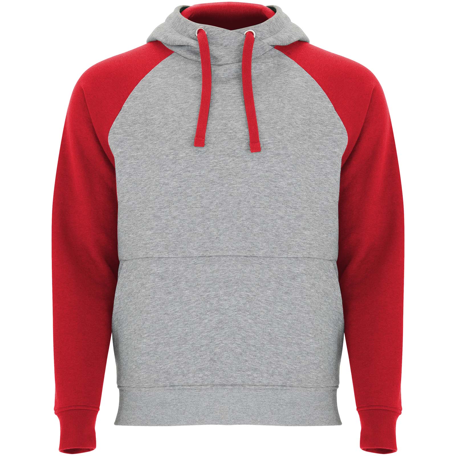 Sudadera con capucha bicolor unisex. Capucha con cuello cruzado y ojales metálicos. Interior de la capucha, cordón de ajuste y mangas raglán en contraste. Bolsillo tipo canguro. Puños y dobladillo de punto de elastano 1× 1. Etiqueta extraíble.