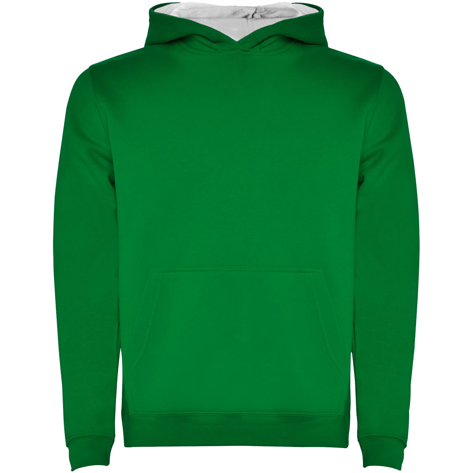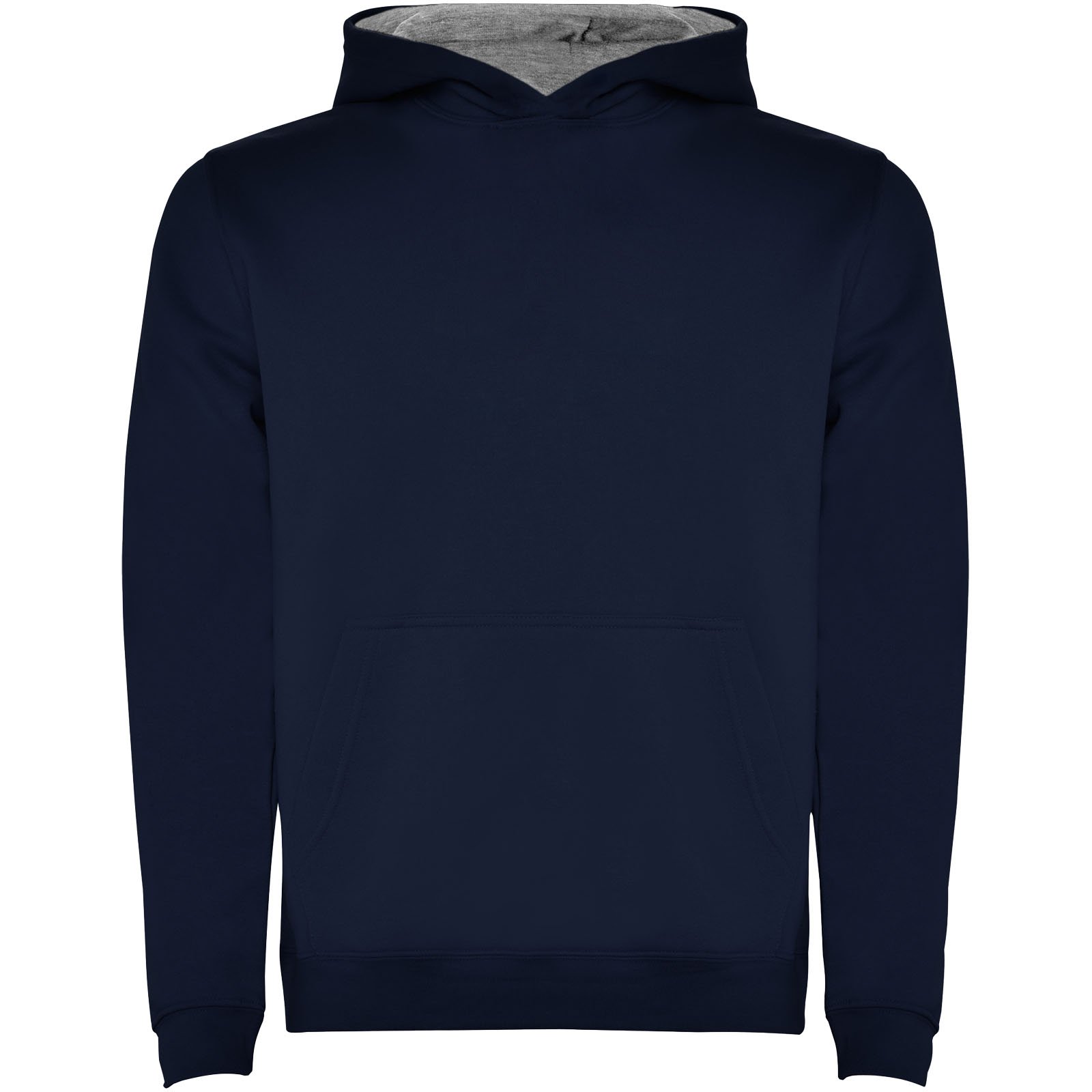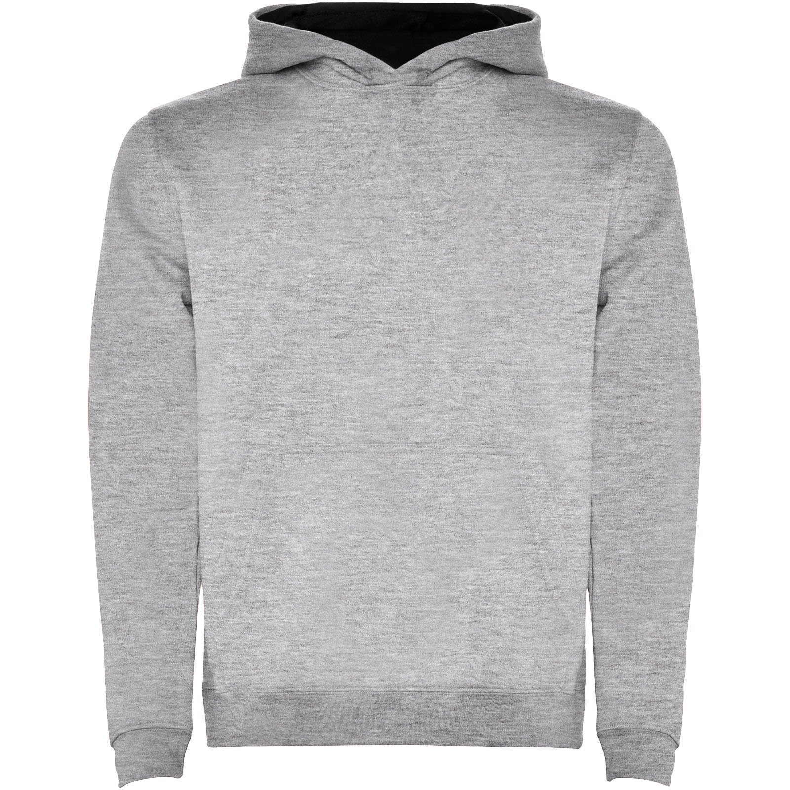 Sudadera con capucha de doble tejido bicolor, cubrecosturas reforzados y bolsillo tipo canguro. Punto canalé con elastano 1×1 en puños y cintura. Etiqueta extraíble. El modelo mide 120 cms y lleva una talla 5/6.