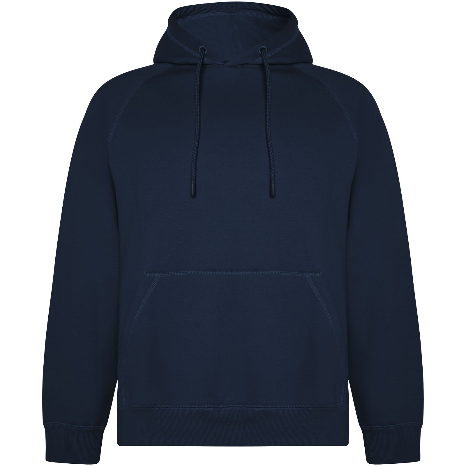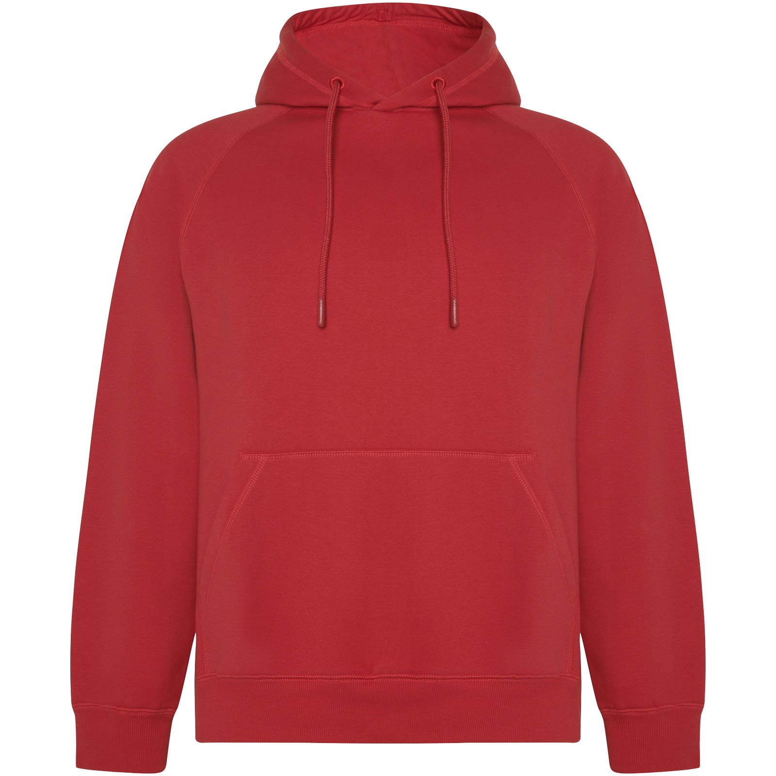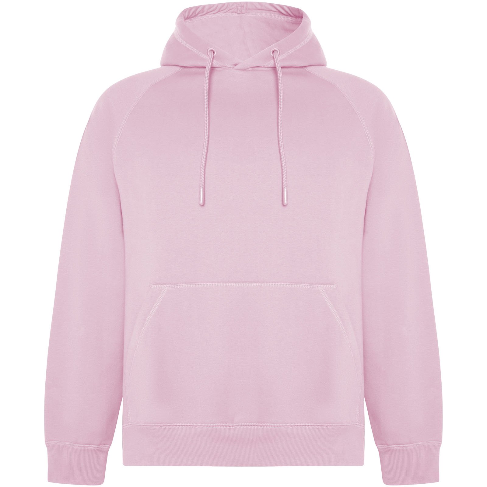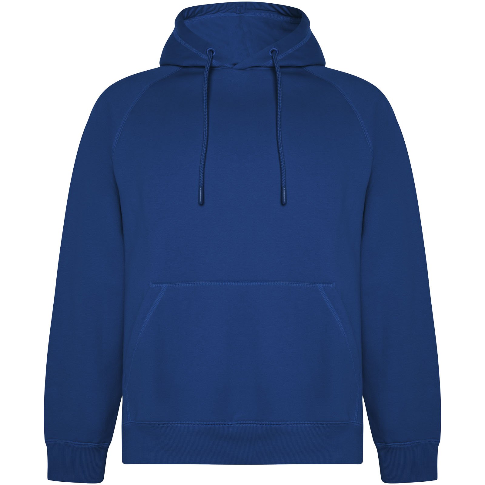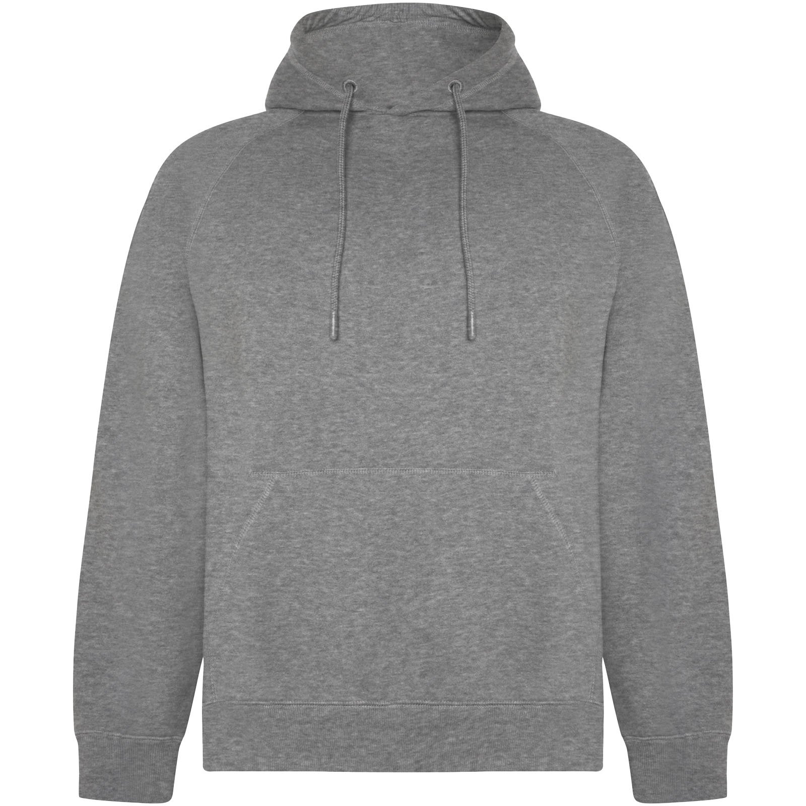 Sudadera con capucha unisex en algodón orgánico cepillado y poliéster reciclado. Bolsillo tipo canguro. Capucha con forro de punto liso, cordones redondos ajustables y ojales bordados. Puños y cintura de punto canalé 2×1. Etiqueta extraíble. Bolsa individual de material reciclado. El modelo masculino mide 185 cms y lleva una talla L, y la modelo femenina mide 168 cms y lleva una talla S.