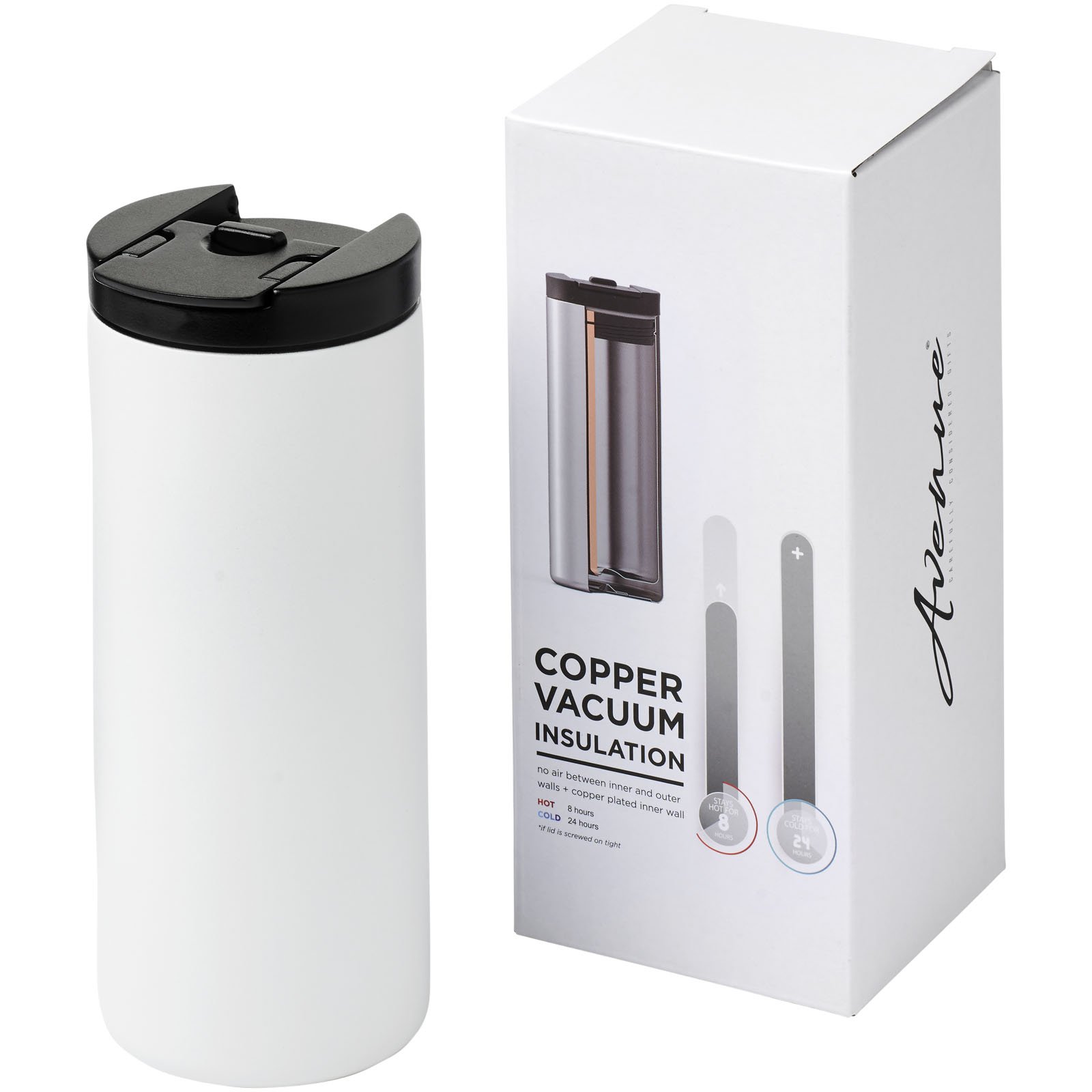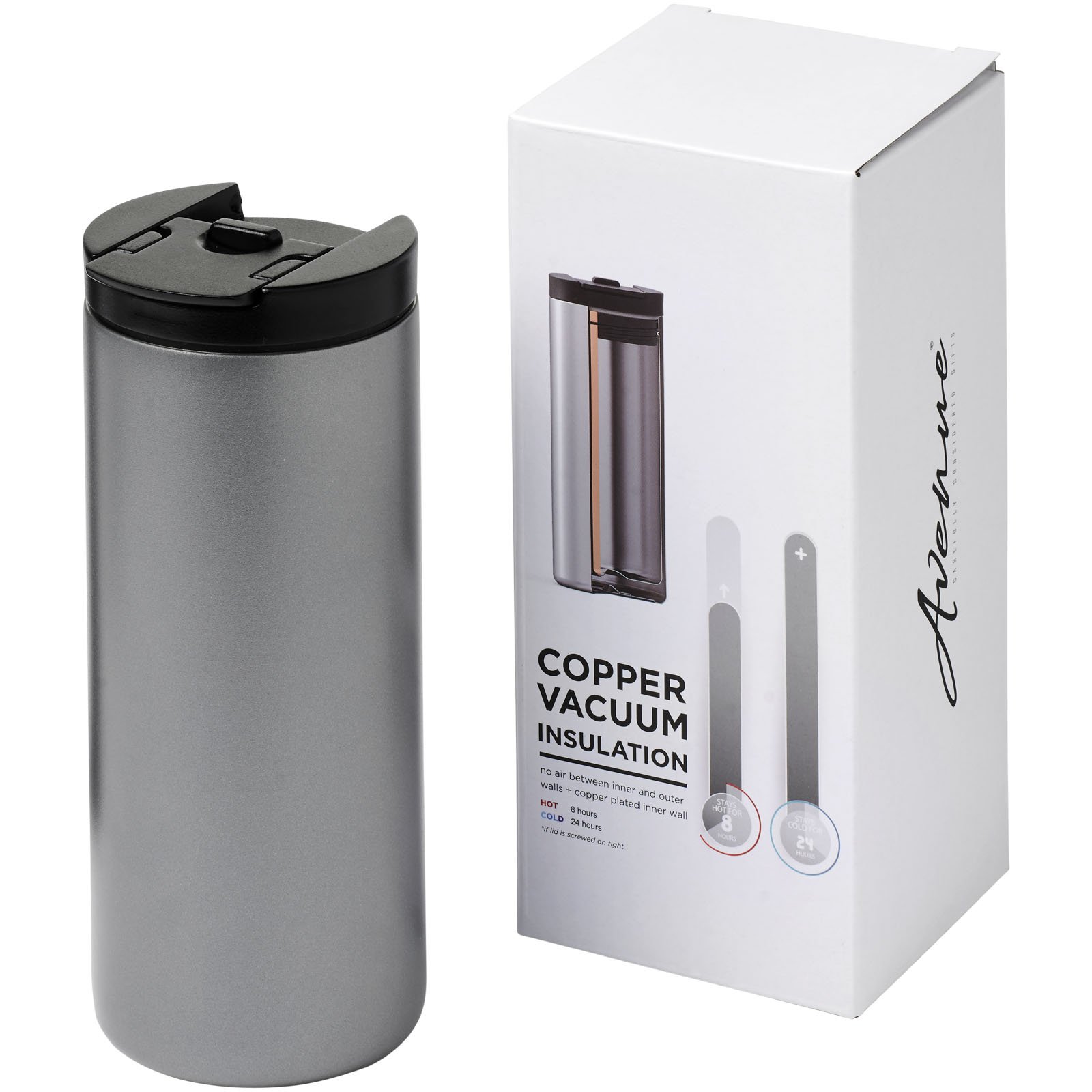Un vaso compacto y duradero es ideal para llevar al trabajo o de viaje. El vaso cuenta con una construcción hermética de doble pared de acero inoxidable con aislamiento de cobre, lo que significa que mantiene las bebidas calientes durante 8 horas y frías durante 24 horas. La tapa tiene una función de bloqueo. La construcción también evita la condensación en el exterior del vaso. Capacidad de 360 ml. Se presenta en una caja de regalo «Avenue».